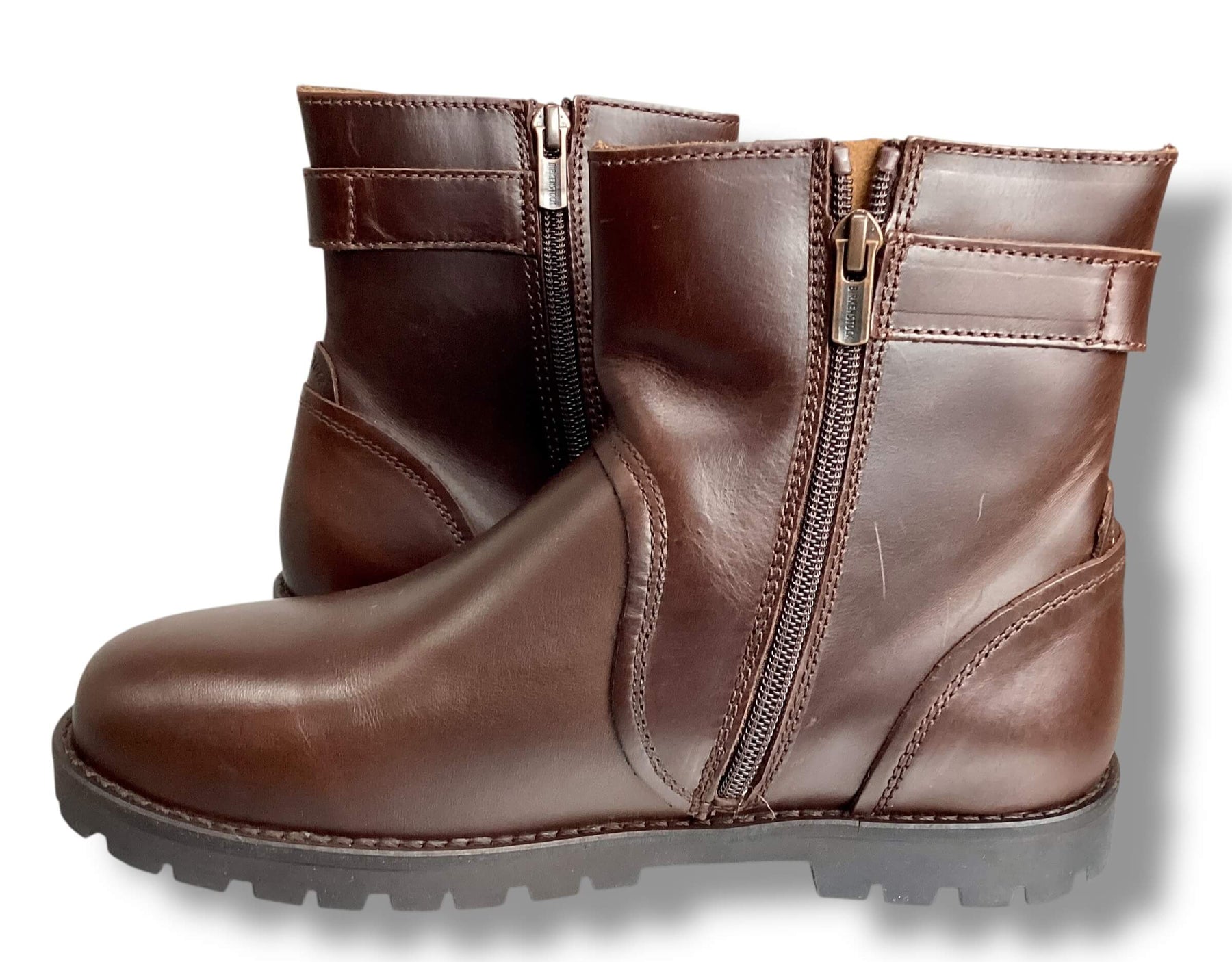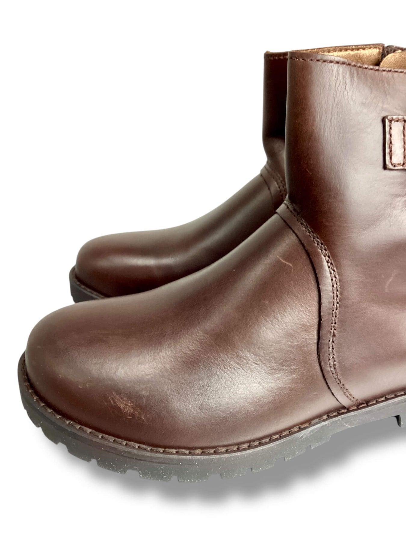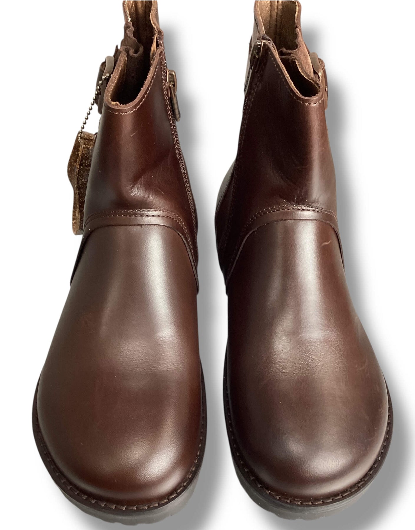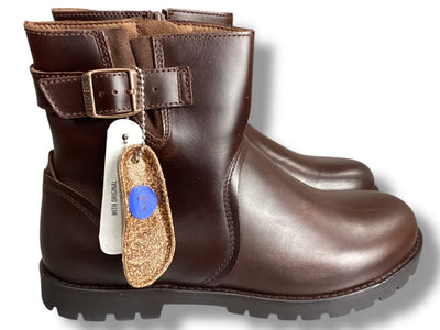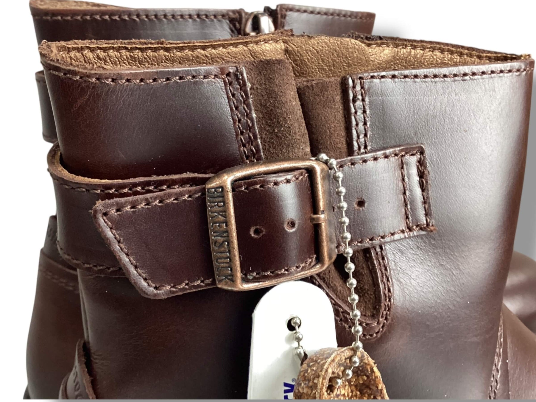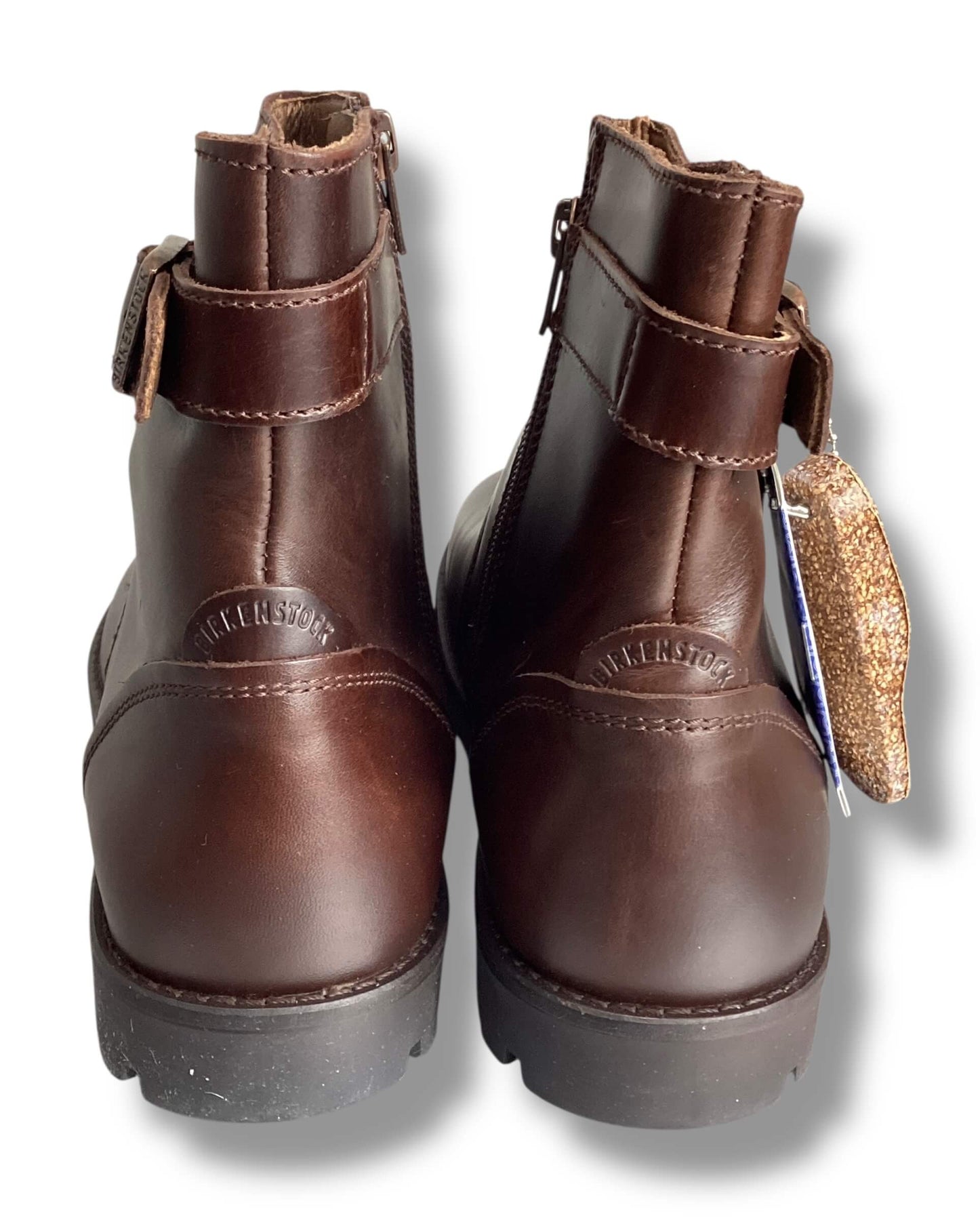 This all-season moto-inspired boot is a basic with attitude backed by the comfortable support of the Birkenstock footbed. Leather smooth, high quality leather with a subtle worn-in finish. Full side zip. Removable contoured cork footbed conforms to the shape of your foot and features pronounced arch support, a deep heel cup, and roomy toe box, lined with suede. Durable rubber sole for traction and support. Never used, minor flaw on one toe, see pic.