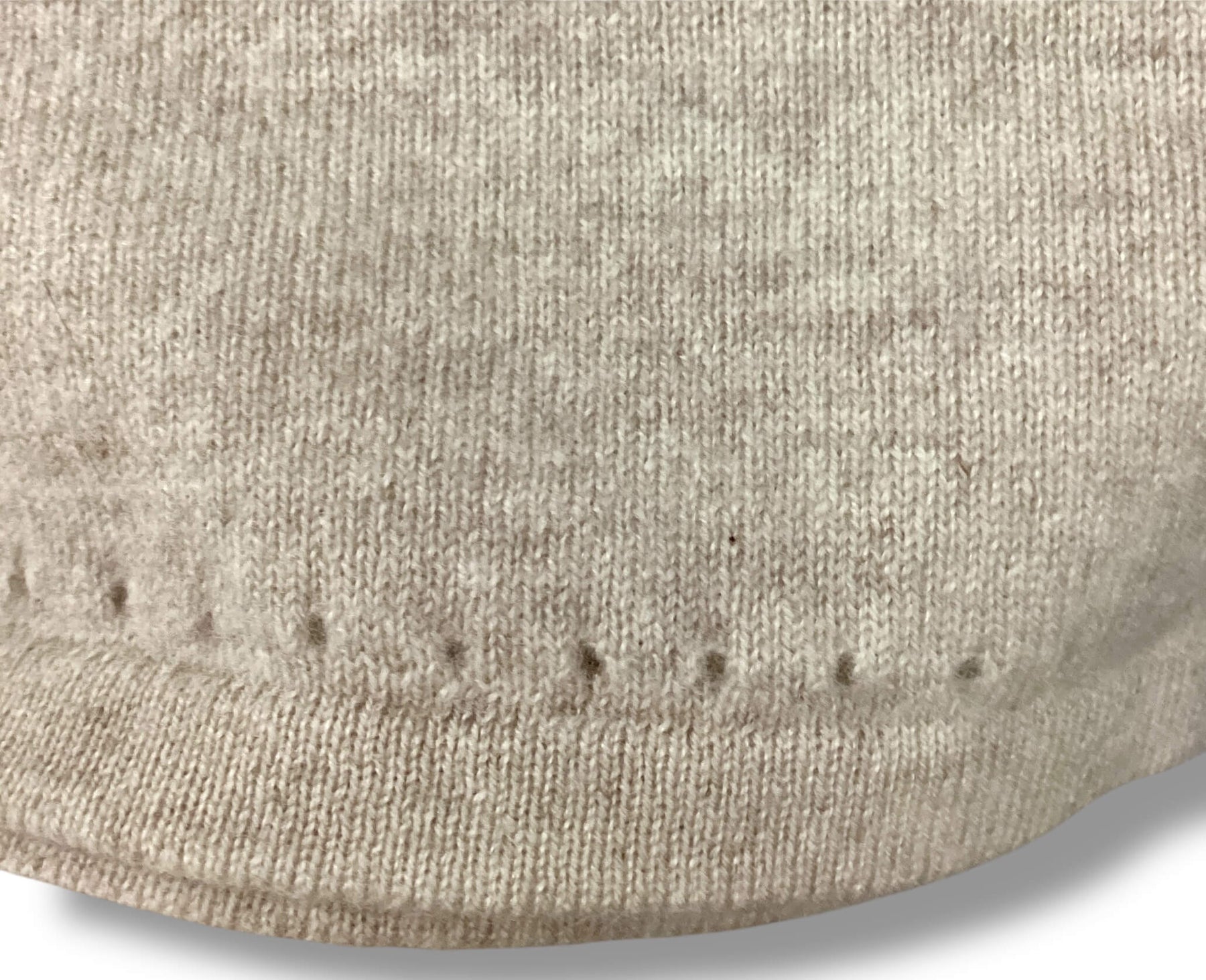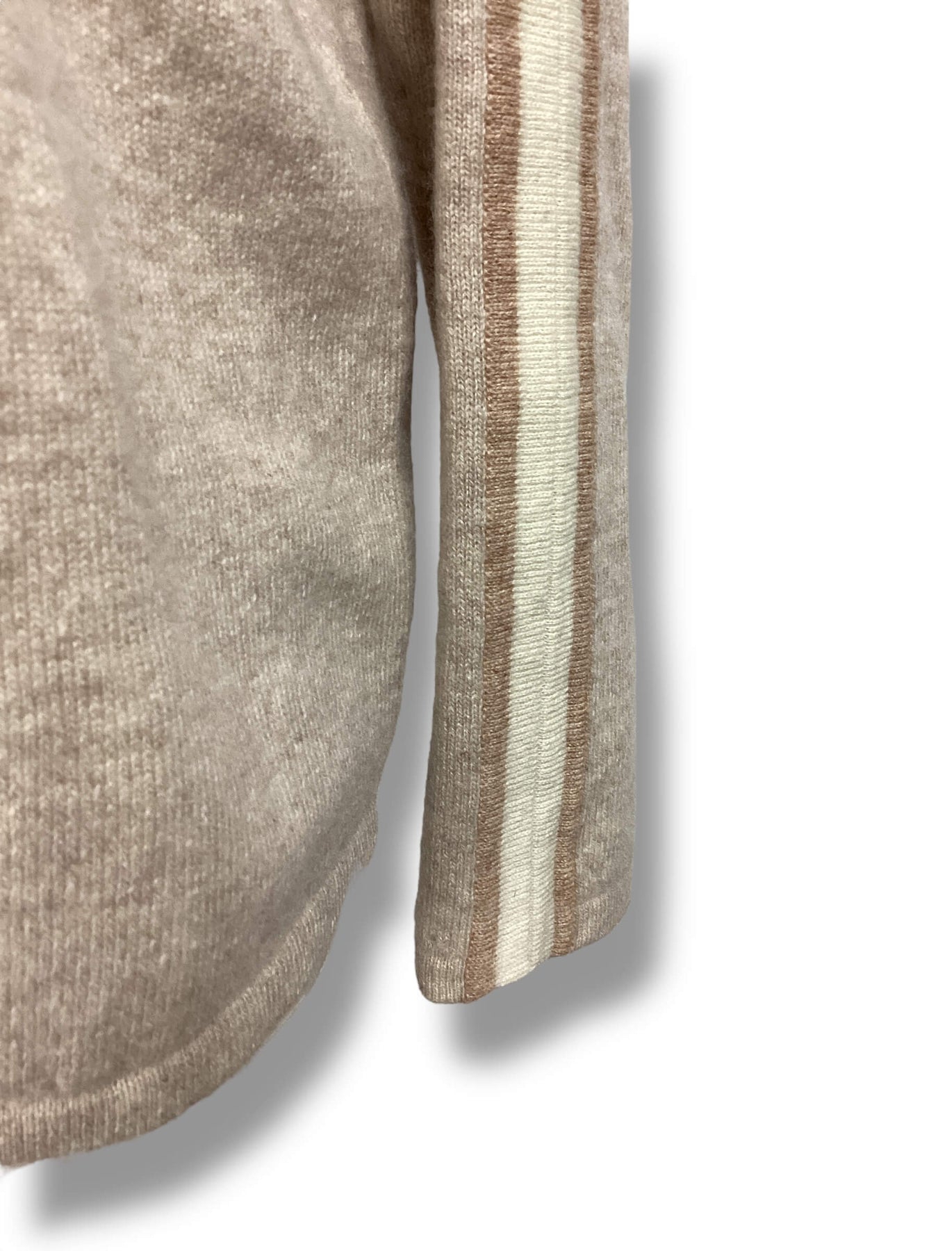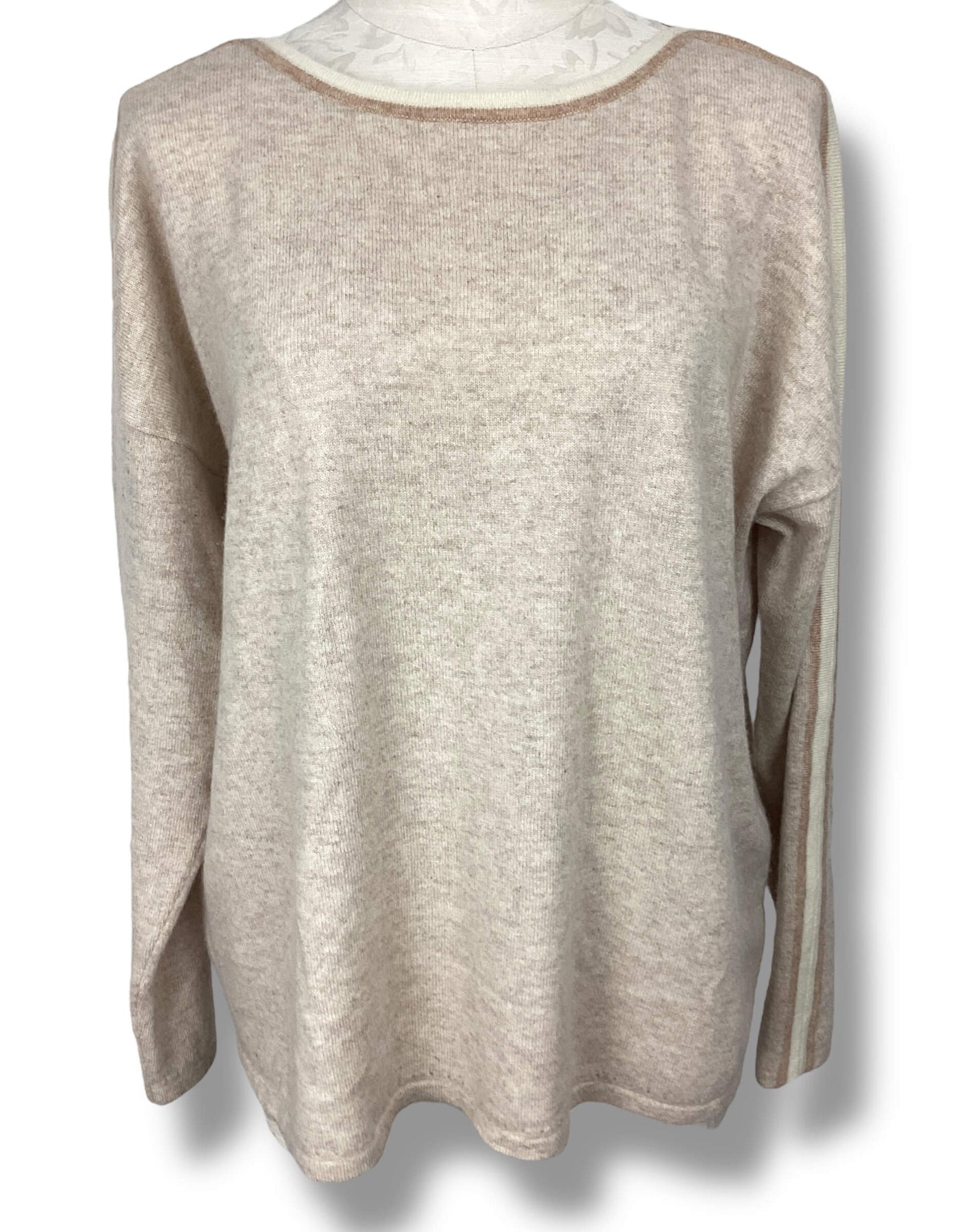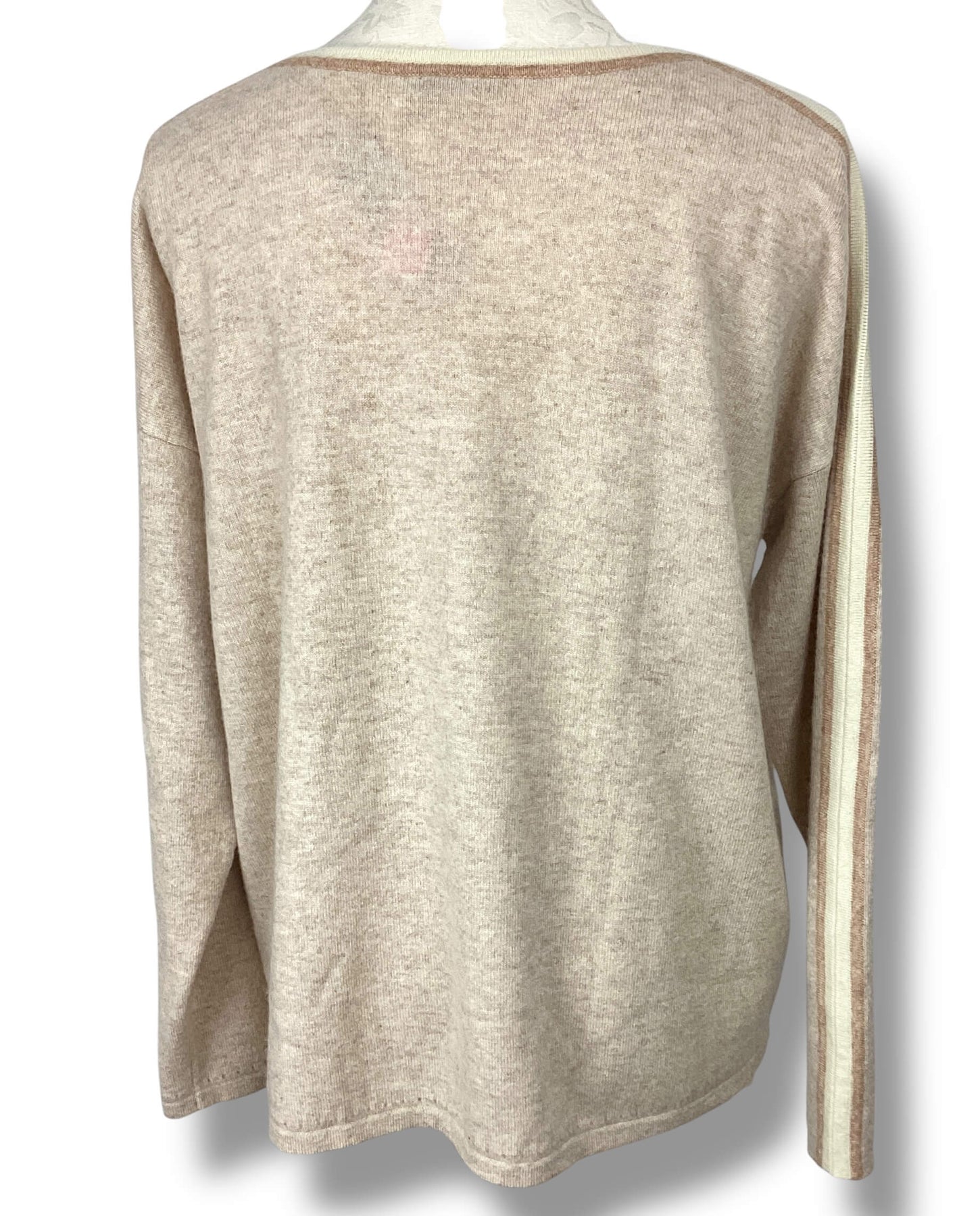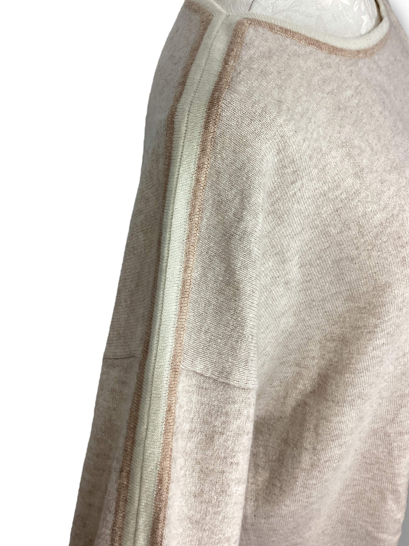 Cashmere sweater with tan and white neckline stripe that runs down arms. Perforated trim detail. Lightly used condition.