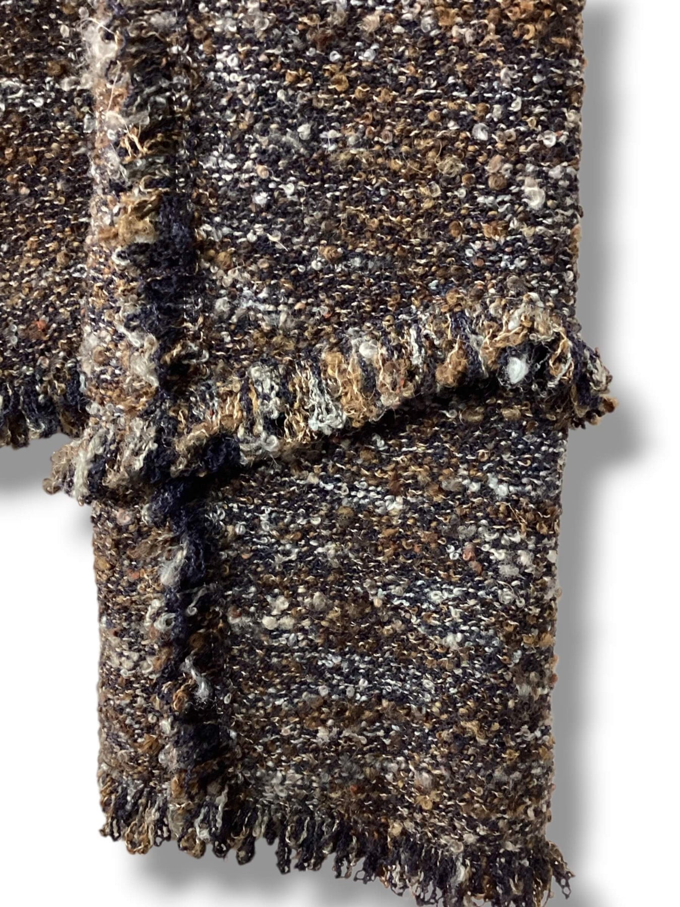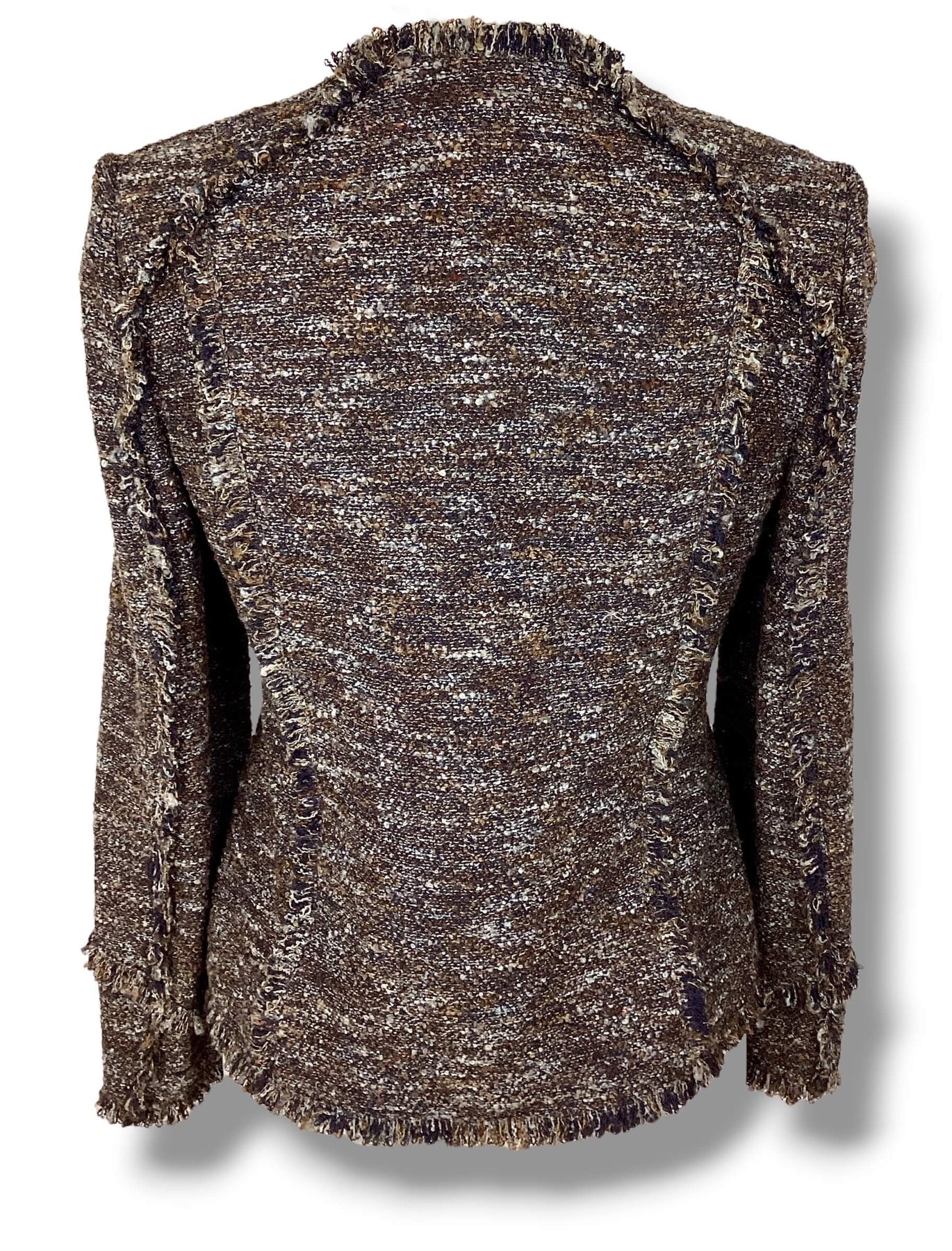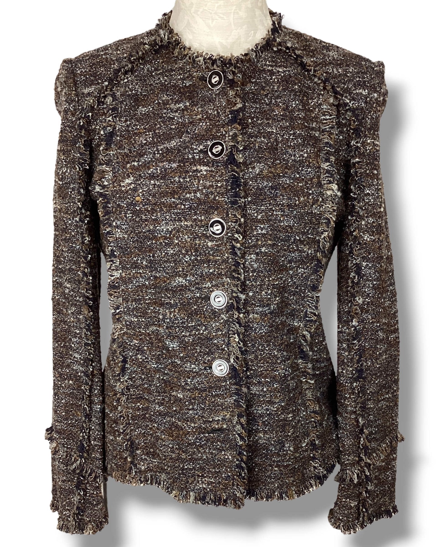 Full button sweater jacket with fringe trim. Speckled brown, white and gray. Branded buttons. Lightly used.