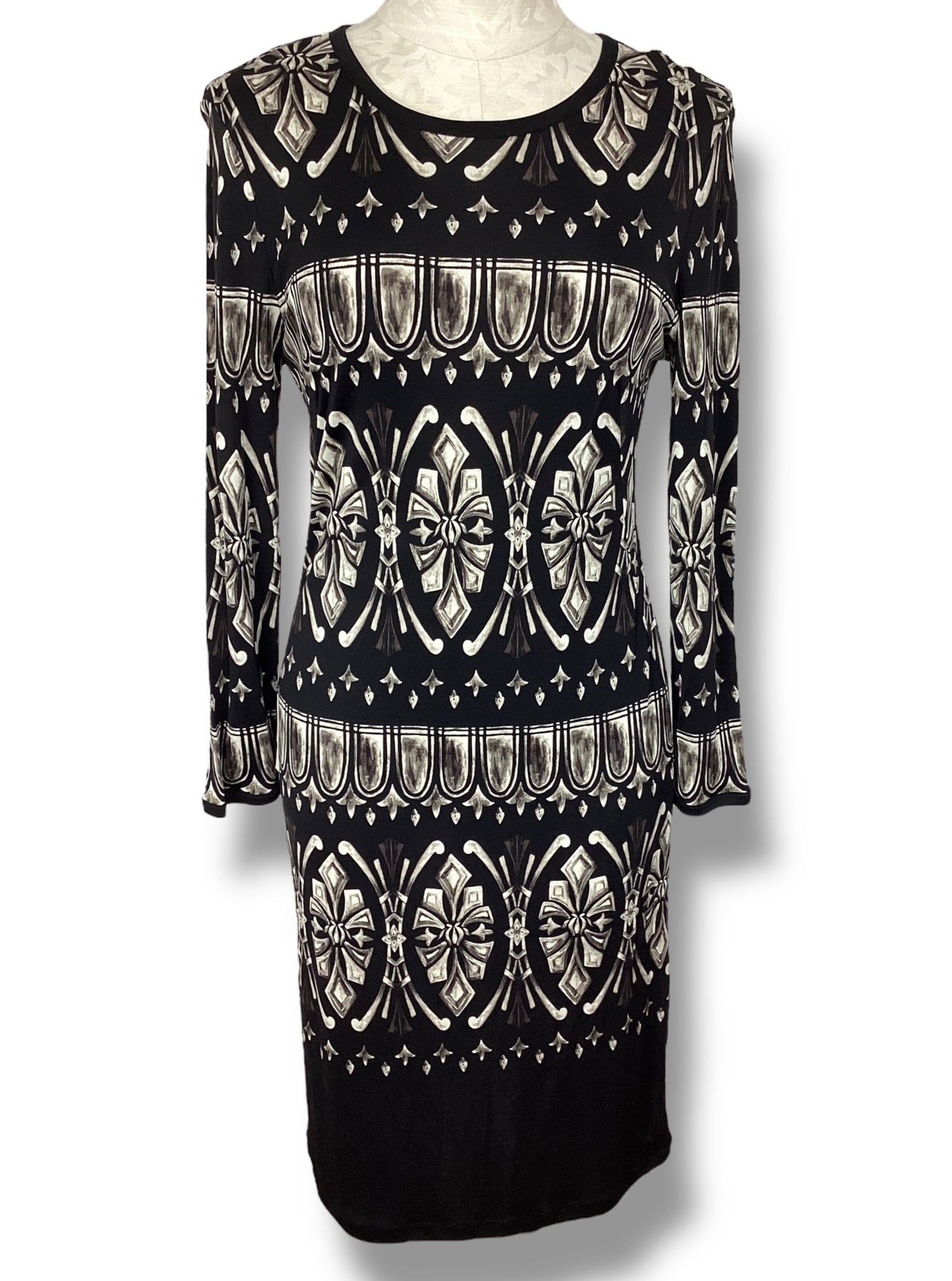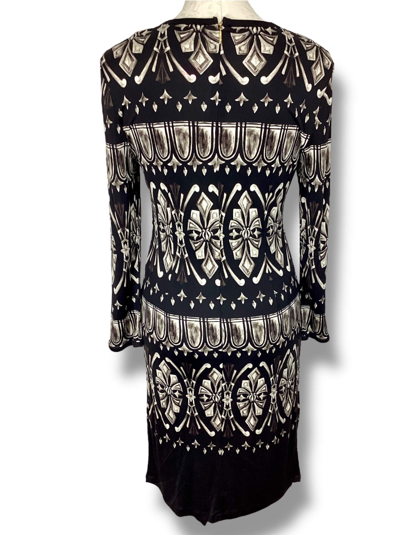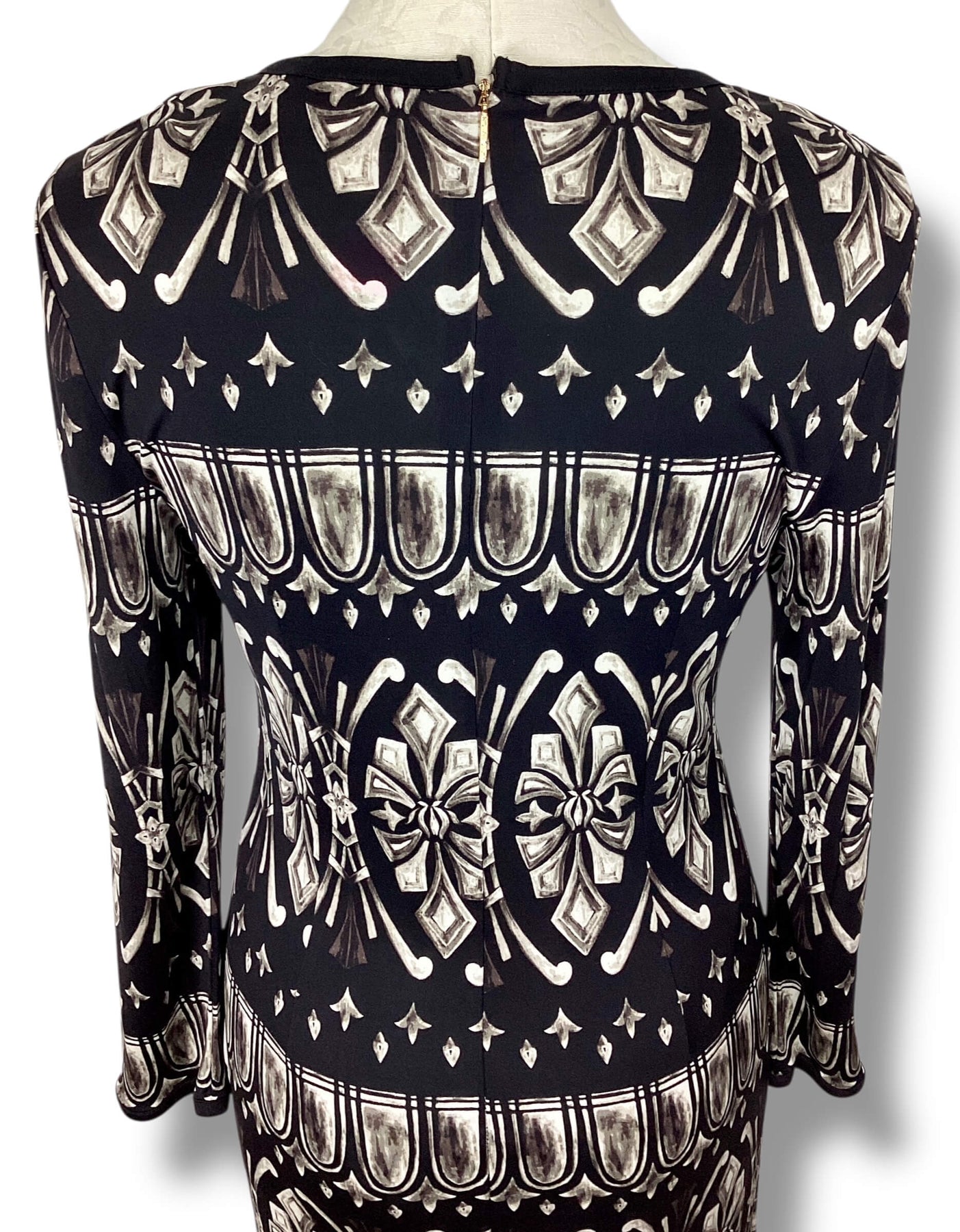 Long sleeve mini dress with back zipper closure. Baroque print on silk jersey fabric. Minor wear, no specific flaws.