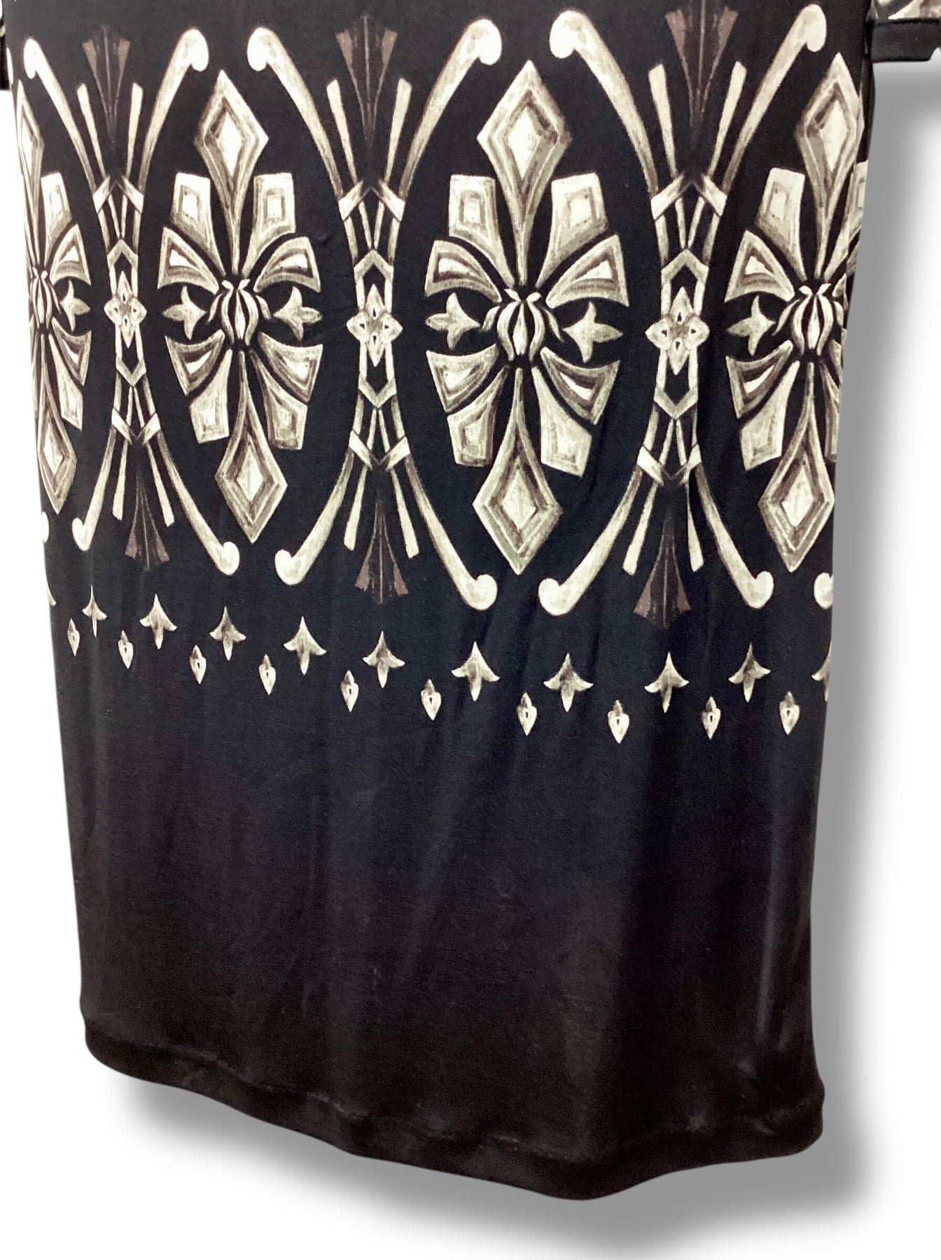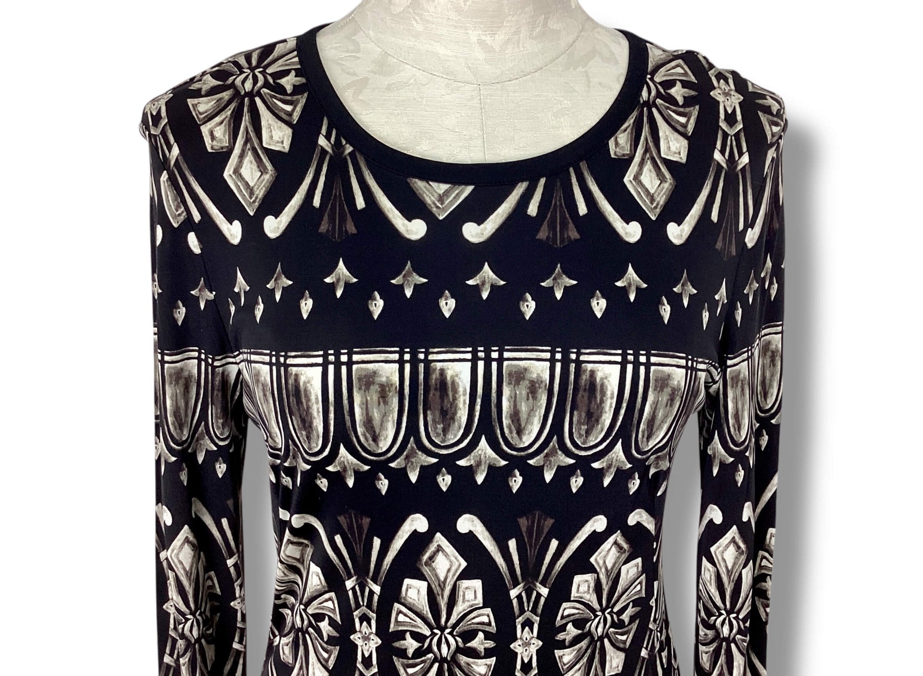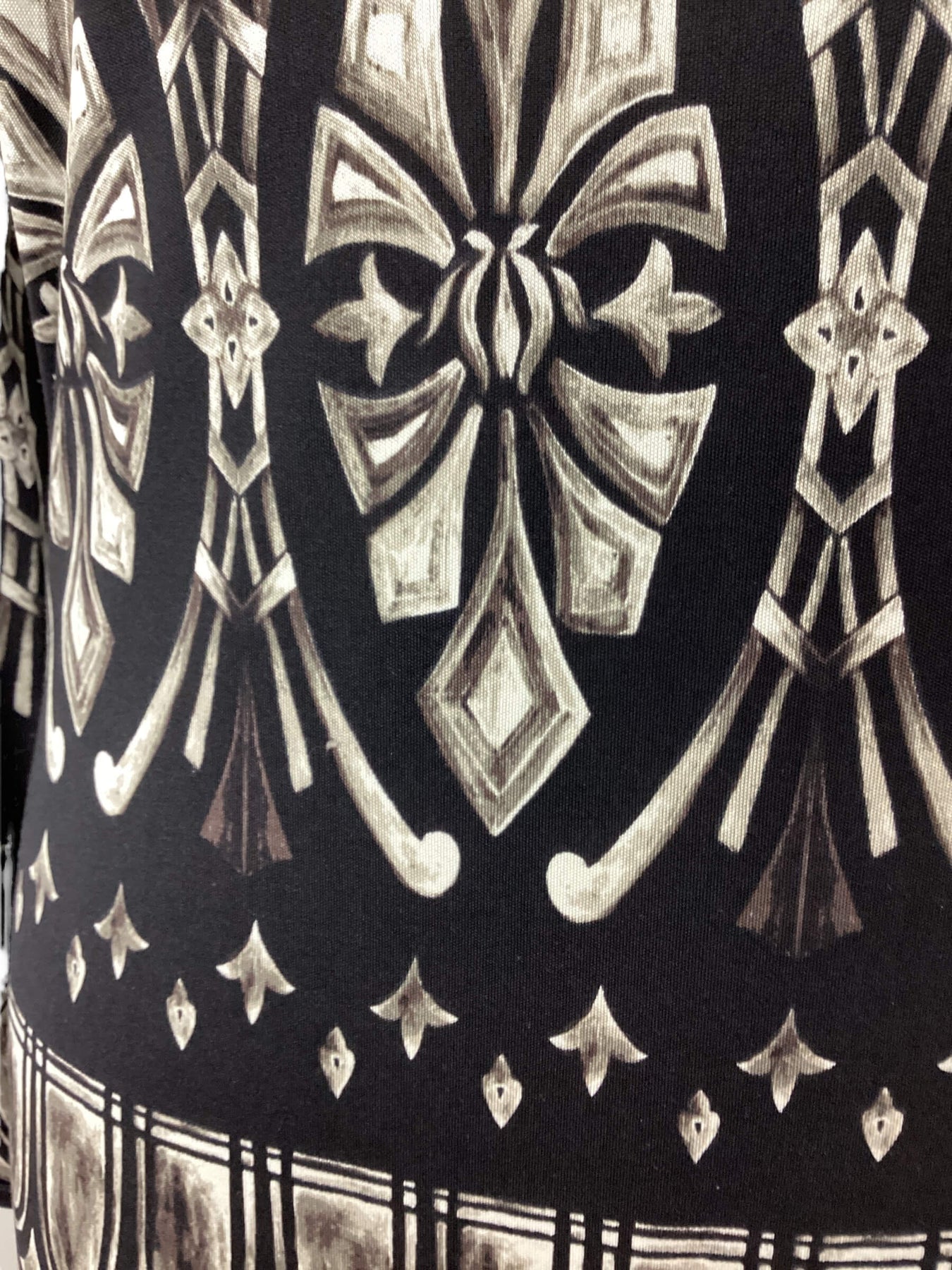 Long sleeve mini dress with back zipper closure. Baroque print on silk jersey fabric. Minor wear, no specific flaws.